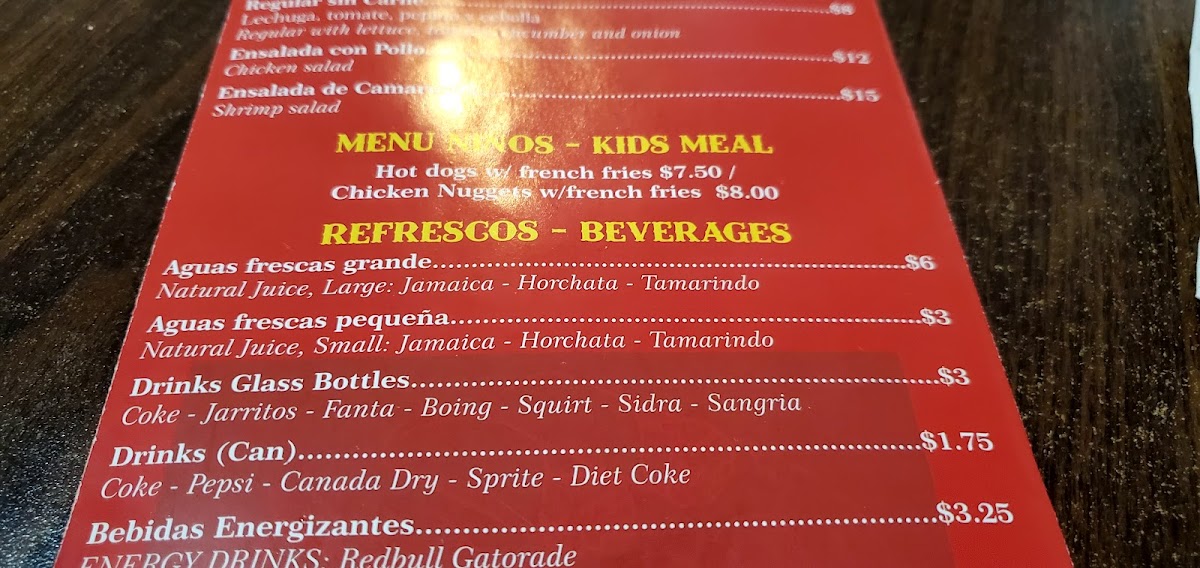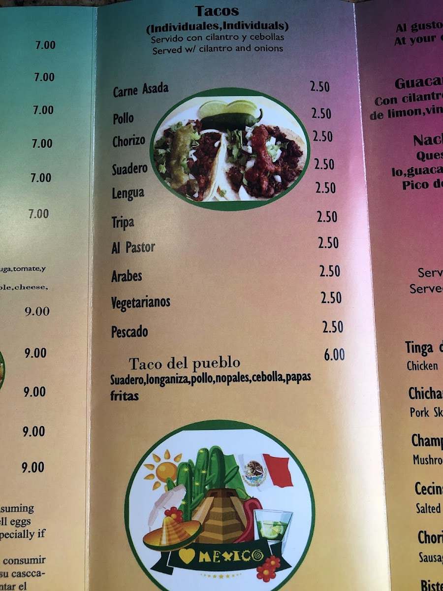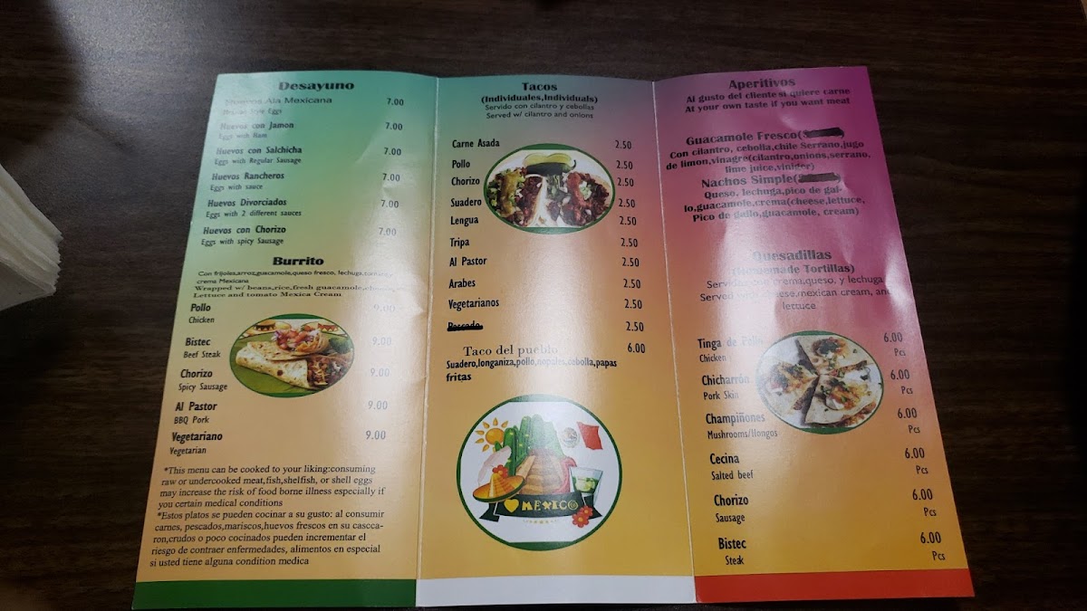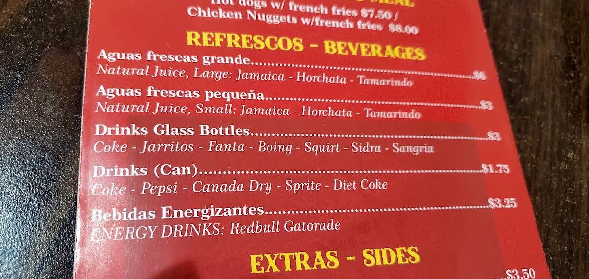 Bistec, jamon, tocino, chorizo, queso y 1 jalapeño. Beef, ham, bacon, sausage, cheese and 1 jalapeño.